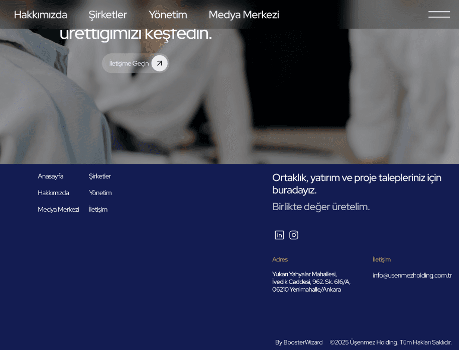 Booster Wizard olarak Üşünmez Holding’in kurumsal web sitesini modern tasarım anlayışıyla baştan kurguladık. Holding bünyesindeki şirketleri, faaliyet alanlarını ve medya içeriklerini kullanıcıya en anlaşılır şekilde sunacak yalın ve profesyonel bir yapı oluşturduk. Ana sayfada güven duygusunu artıran güçlü bir kurumsal iletişim dili tercih edilirken; alt şirket sayfaları, faaliyet alanları ve organizasyon yapısı sade bir navigasyonla kolayca ulaşılabilir hale getirildi. Yönetim kurulu üyeleri için özel olarak hazırlanan bölüm, holdingin kurumsal yapısını güçlü bir şekilde yansıtırken; medya merkezi, basın ve haber içeriklerini düzenli ve erişilebilir bir formatla kullanıcıya sunacak şekilde optimize edildi. Yeni site, Üşünmez Holding’in vizyonunu dijital alanda modern ve güvenilir bir yüzle temsil ediyor.